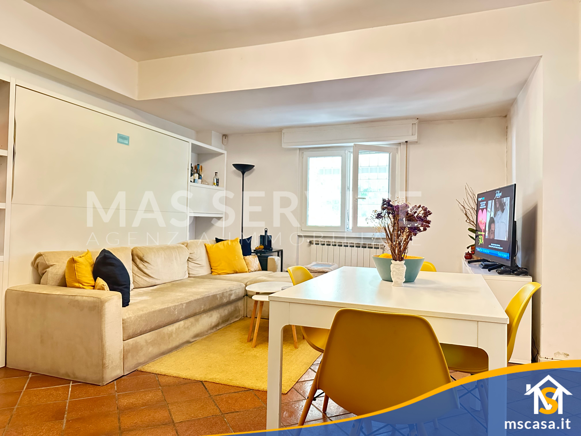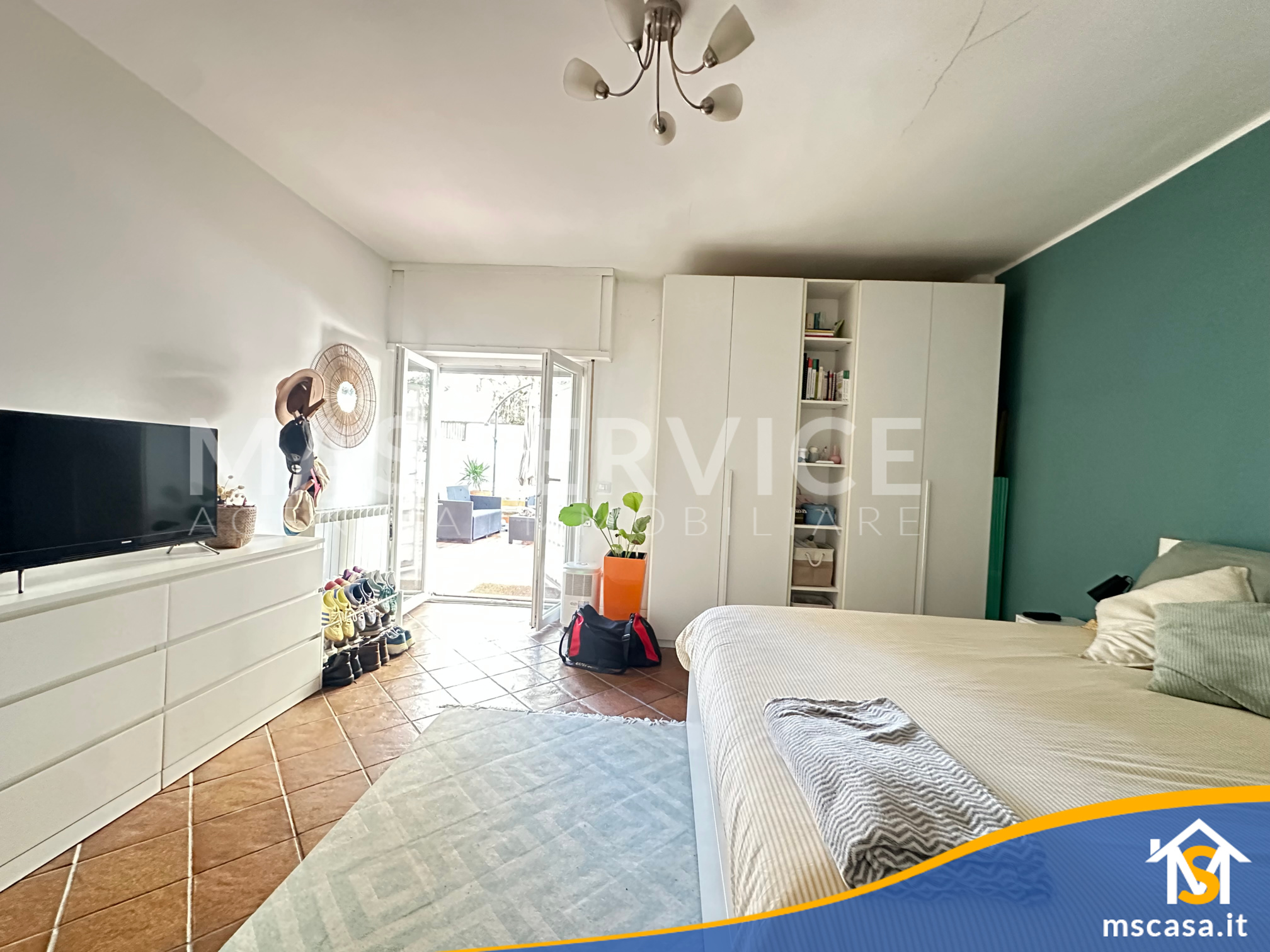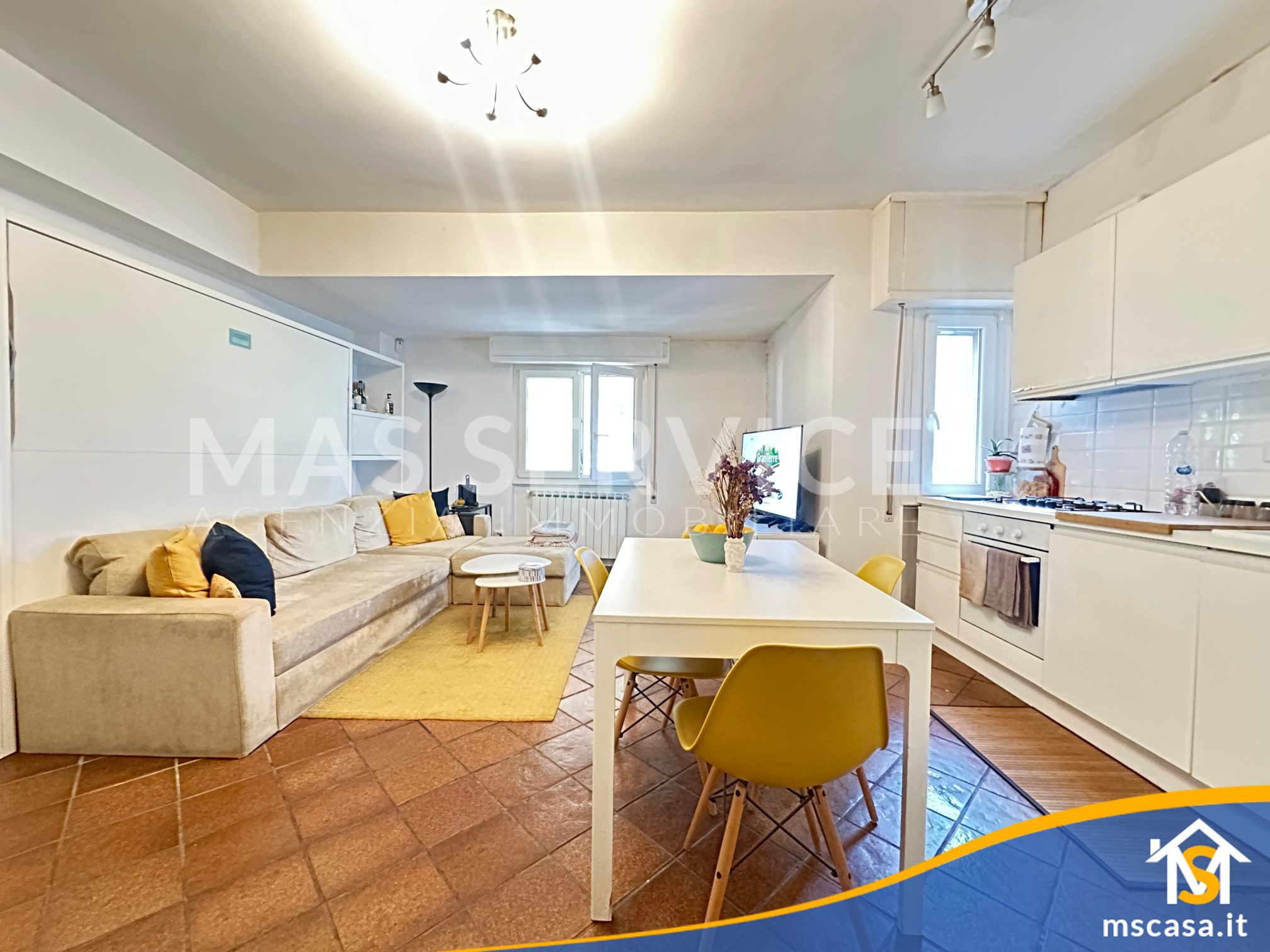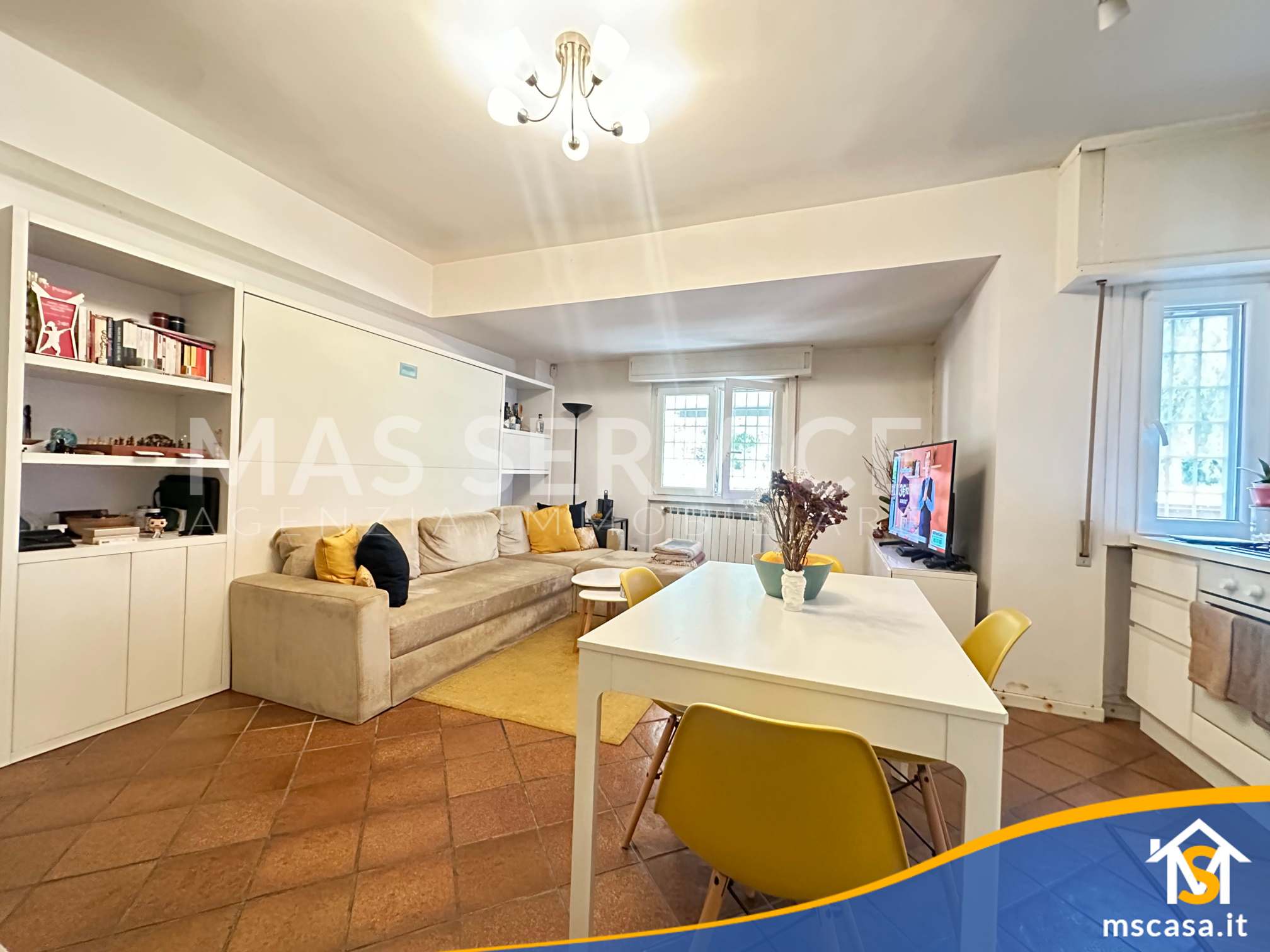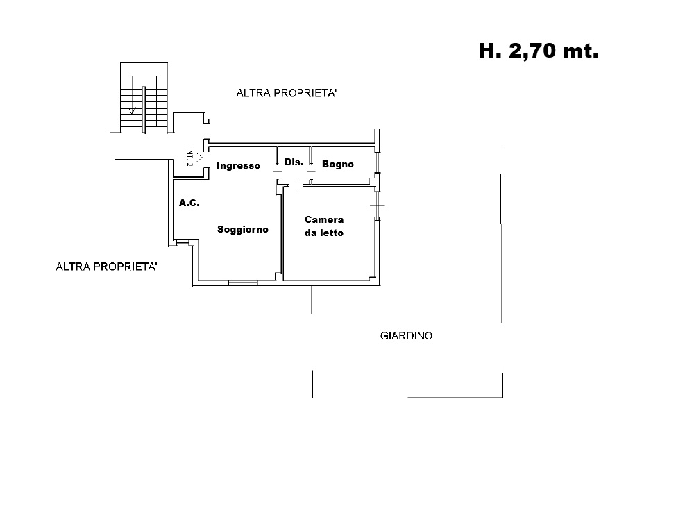 L'immobile è così composto: Ingresso su soggiorno con angolo cottura, Disimpegno, Camera da letto, Bagno con finestra e Box doccia, Giardino pavimentato di 90 mq. ca.