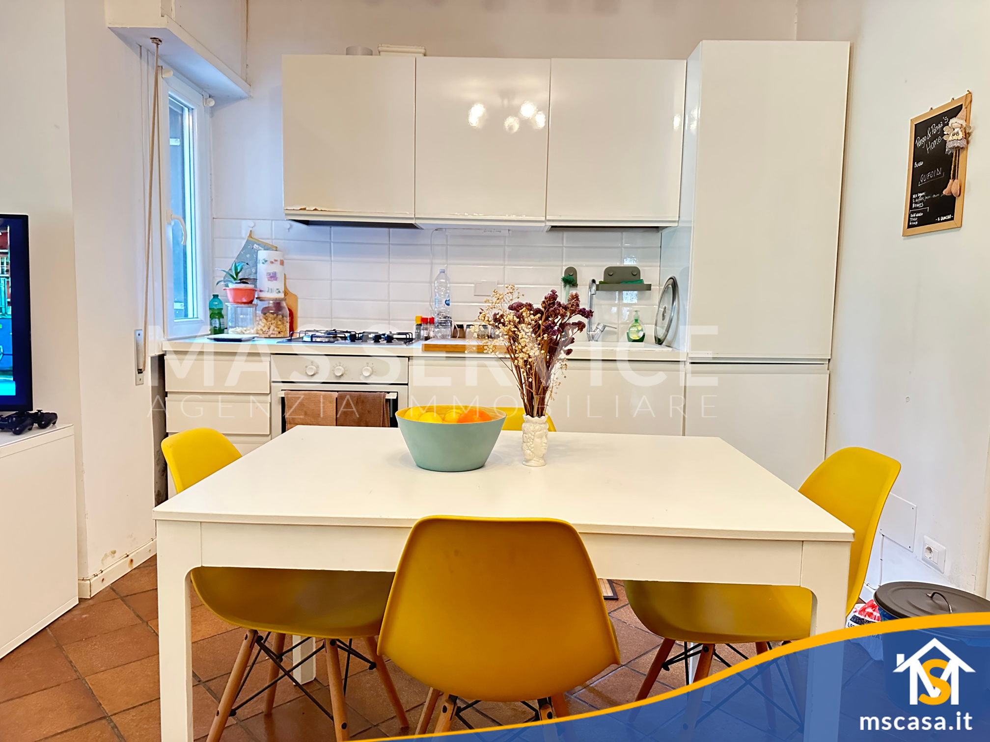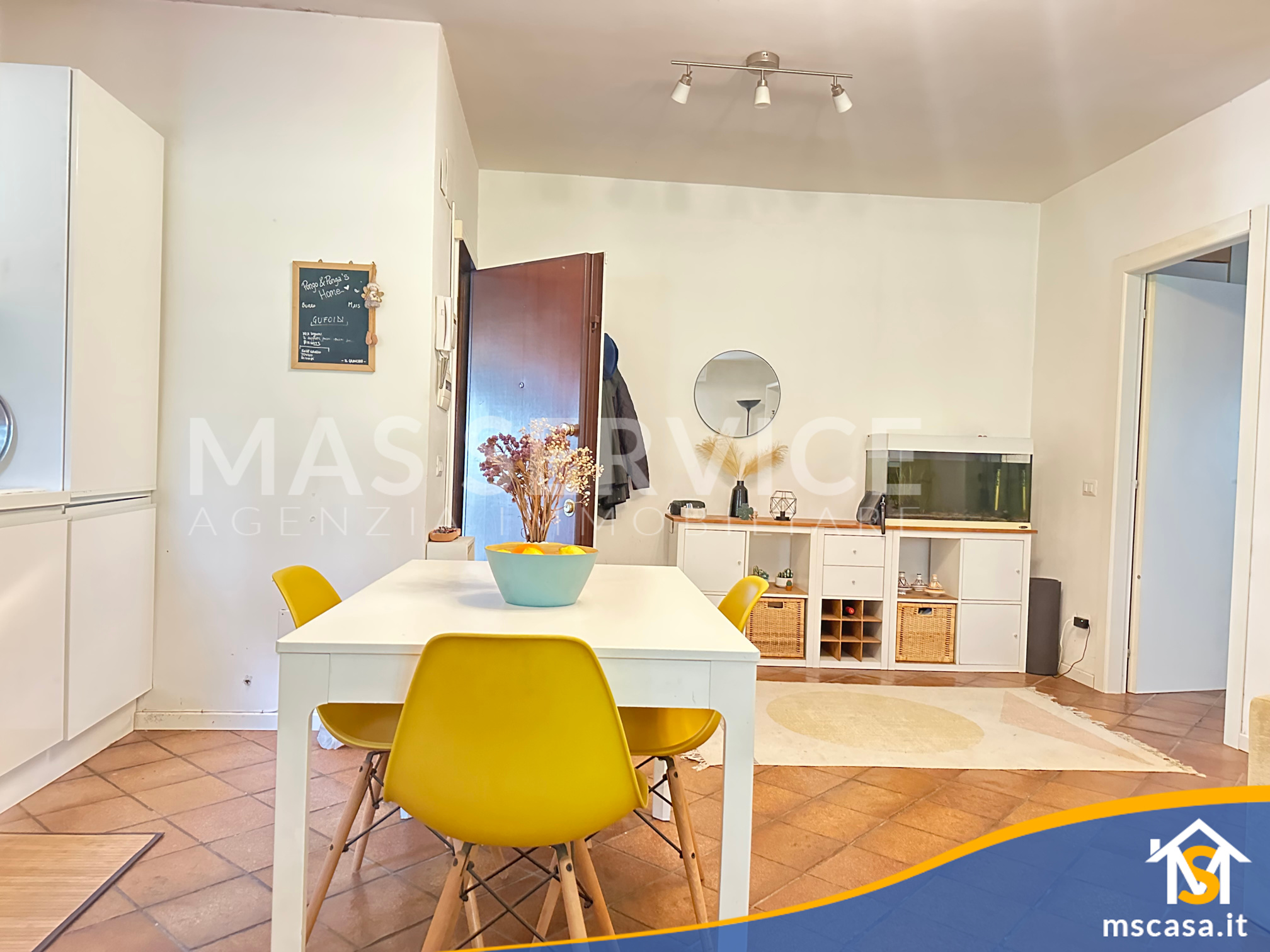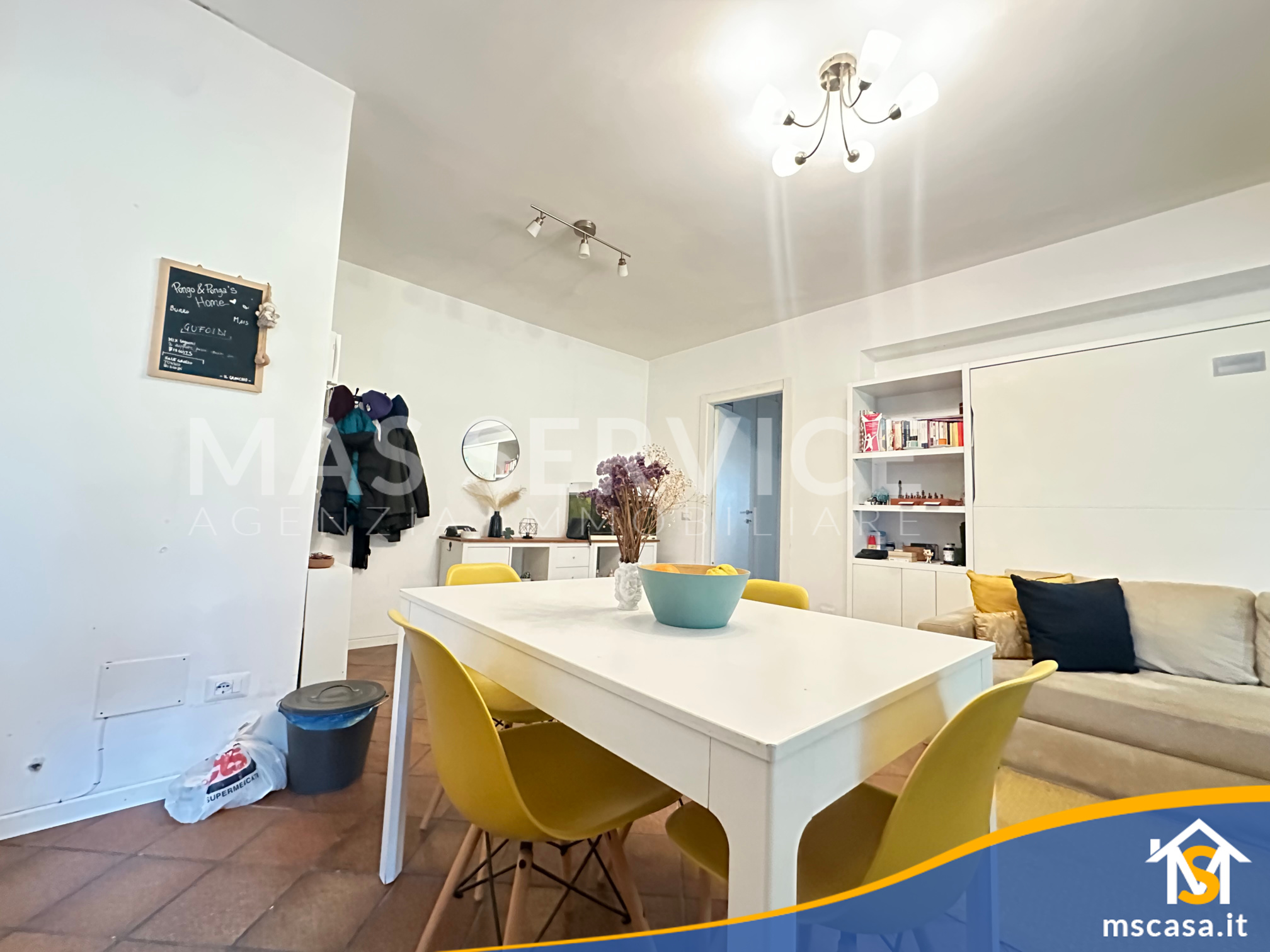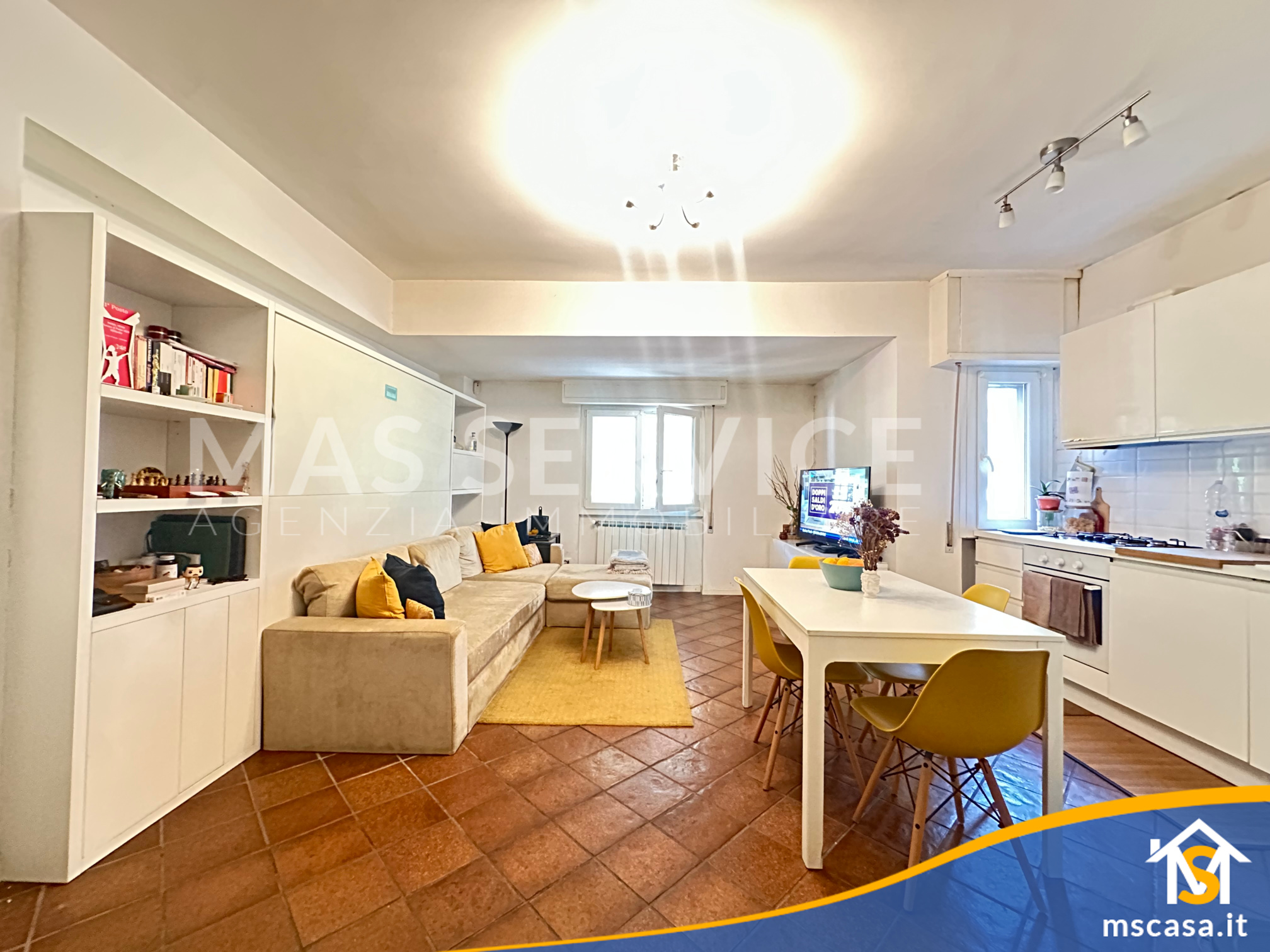 L'immobile è così composto: Ingresso su soggiorno con angolo cottura, Disimpegno, Camera da letto, Bagno con finestra e Box doccia, Giardino pavimentato di 90 mq. ca.
