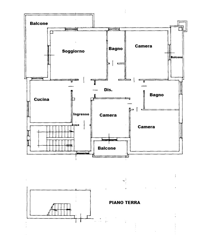 L'immobile è così composto: Ingresso al Piano Terra con due rampe di scale; Ingresso appartamento, Soggiorno, Cucina abitabile con termo camino, 3 Camere, 2 Bagni con finestra, 3 Balconi, Giardino.