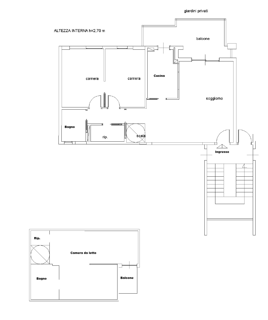L'immobile è così composto: Ingresso su Soggiorno, Cucina semi abitabile, Disimpegno, Camera, Bagno con finestra e box doccia, Ripostiglio, Balcone, scala per accedere al livello superiore, Camera da letto padronale mansardata, Bagno con box doccia, Ripostiglio e armadi a muro, Balcone.